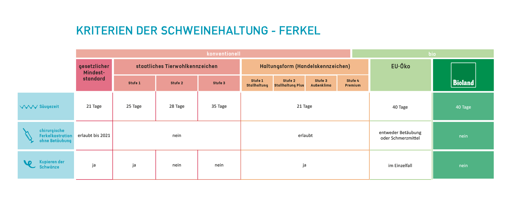 Außerdem haben die Schweine, auch in den höchsten Stufen der beiden Kennzeichnungssysteme, mehr als 50 Prozent weniger Platz im Stall (inklusive Auslauffläche) als es im Öko-Recht Standard ist (2,3 qm gegenüber maximal 1,5 qm). Auslauf erhalten die Tiere nur in den obersten Stufen. Auch im Bereich des Einsatzes von Antibiotika und Arzneimitteln weist keine der Stufen eine Einschränkung auf. Der Verbraucher dürfte hingegen davon ausgehen, dass mit jeder Stufe auch eine stufenweise Besserung der entscheidenden Kriterien einhergeht. Auffallend ist zudem, dass die Haltungskriterien der Muttertiere und Ferkel nahezu ausgeklammert werden. Bei beiden Labels hat jedes Tier in allen Stufen nur den gesetzlichen Mindeststandard von maximal 2,5 qm Fläche zur Verfügung (gegenüber 7,5 qm nach EU-Ökoverordnung und Bioland). Auch Kastenstände, also die Fixierung von Sauen kurz vor und nach der Geburt, bleiben erlaubt. Genauso wie das Kupieren der Schweineschwänze, welches lediglich beim staatlichen Tierwohllabel und da auch erst ab Stufe (2) nicht mehr erlaubt ist.