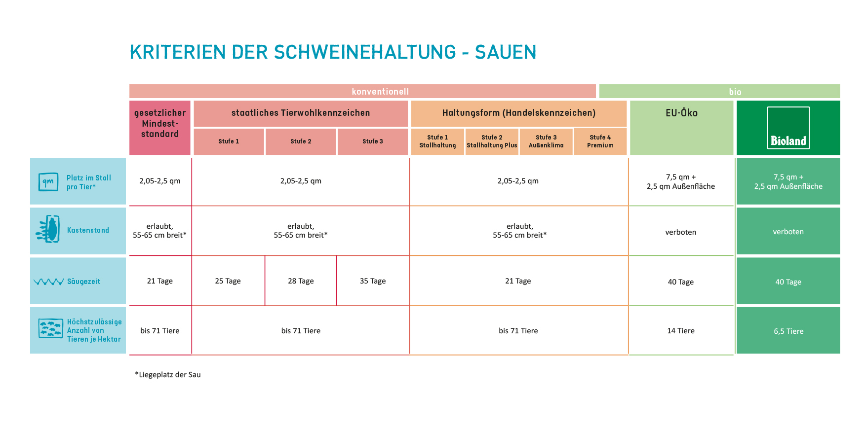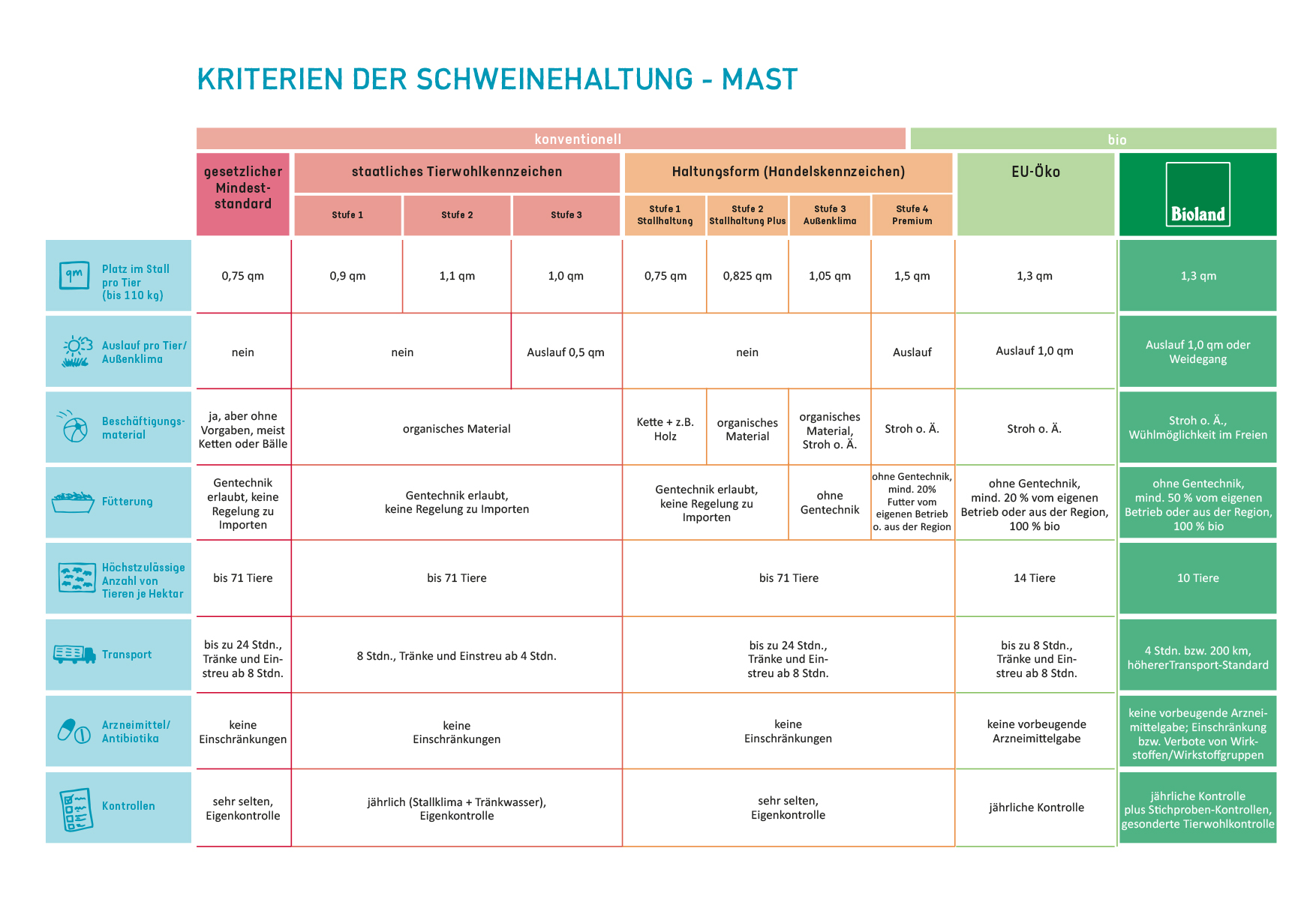 Außerdem haben die Schweine, auch in den höchsten Stufen der beiden Kennzeichnungssysteme, mehr als 50 Prozent weniger Platz im Stall (inklusive Auslauffläche) als es im Öko-Recht Standard ist (2,3 qm gegenüber maximal 1,5 qm). Auslauf erhalten die Tiere nur in den obersten Stufen. Auch im Bereich des Einsatzes von Antibiotika und Arzneimitteln weist keine der Stufen eine Einschränkung auf. Der Verbraucher dürfte hingegen davon ausgehen, dass mit jeder Stufe auch eine stufenweise Besserung der entscheidenden Kriterien einhergeht. Auffallend ist zudem, dass die Haltungskriterien der Muttertiere und Ferkel nahezu ausgeklammert werden. Bei beiden Labels hat jedes Tier in allen Stufen nur den gesetzlichen Mindeststandard von maximal 2,5 qm Fläche zur Verfügung (gegenüber 7,5 qm nach EU-Ökoverordnung und Bioland). Auch Kastenstände, also die Fixierung von Sauen kurz vor und nach der Geburt, bleiben erlaubt. Genauso wie das Kupieren der Schweineschwänze, welches lediglich beim staatlichen Tierwohllabel und da auch erst ab Stufe (2) nicht mehr erlaubt ist.