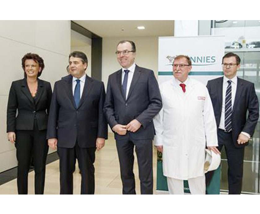 Bei einem Besuch des Tönnies Werks in Rheda-Wiedenbrück nahm Sigmar Gabriel Einblick in die Produktionsabläufe und Standards bei einem der größten Fleischproduzenten in Europa. Gastgeber Clemens Tönnies stellte dem stellvertretenden Bundeskanzler und Bundesminister für Wirtschaft und Energie bei einem Betriebsrundgang die Unternehmensgruppe vor.